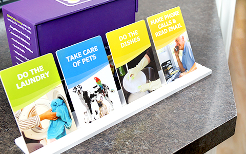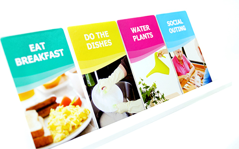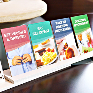 Remember Tasks and Turn Cards: As each task is finished, flip each card around in its stand so the back faces forward. This way, you or your loved one knows what's already been done and what's still left to do! It keeps track of progress and prevents any confusion by doing the same thing twice over.