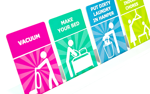 As each chore is completed, your child is able to turn each card around and see their progress until they're done. While it's you that sets it all up, they're able to feel good about a job well done and you can spend more quality time together!