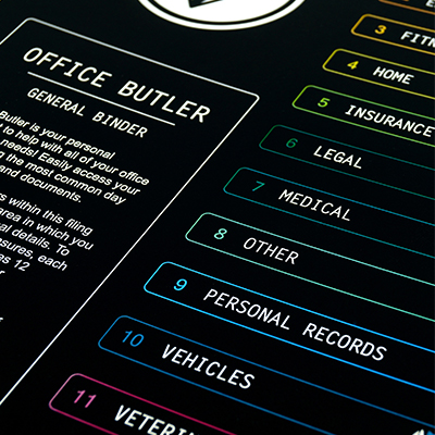 Set Up Your Binders: Office Butler is made to match your office needs! Go through the Financial, Payables and General binders and decide whether or not you want more categories to start. If you do, write in whatever you need to the blank tabs in each Office Butler binder.